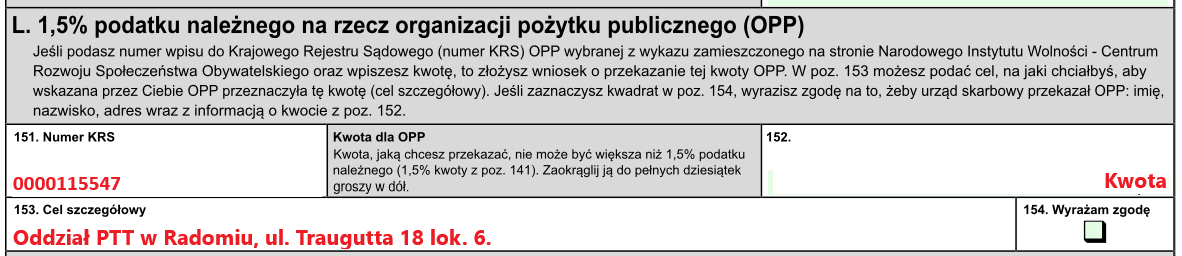 Przekazanie 1.5% podatku jest bardzo proste. Aby tego dokonać należy w odpowiednim miejscu formularza PTT wpisać numer KRS naszego Towarzystwa: 0000115547. Jako cel szczegółowy proszę wskazać Oddział PTT w Radomiu, ul. Traugutta 18 lok. 6.